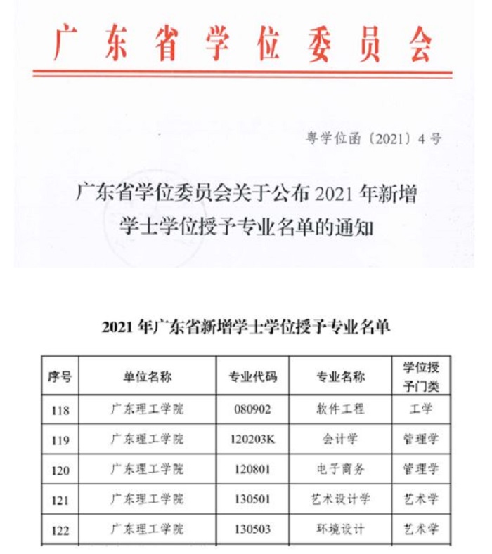近日,广东省学位委员会下发了《广东省学位委员会关于公布2021年新增学士学位授予专业名单的通知》(粤学位函〔2021〕4号),备案并公布了2021年广东省46所高等院校138个新增新增学士学位授予专业。其中我校今年申请新增学士学位授权的会计学、电子商务、艺术设计学、环境设计和软件工程等5个专业全部获准备案。至此,我校具有学士学位授予权的专业达22个。